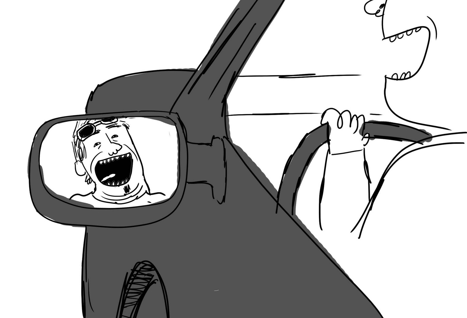 I saw in the side view mirror, her husband laughing like a mad man.